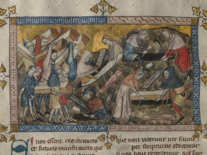Billedet er fra et håndskrift og viser ”Pesten i Tournai”, ca. 1353.