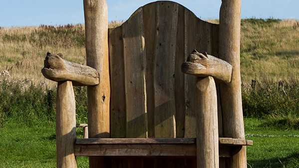 Her står en kæmpestol! Den er så høj, så den er meget svær at komme op i, men når du først er deroppe, kan du føle dig som Odin, der fra stolen kan se ud over hele verden og se alt, hvad der sker.