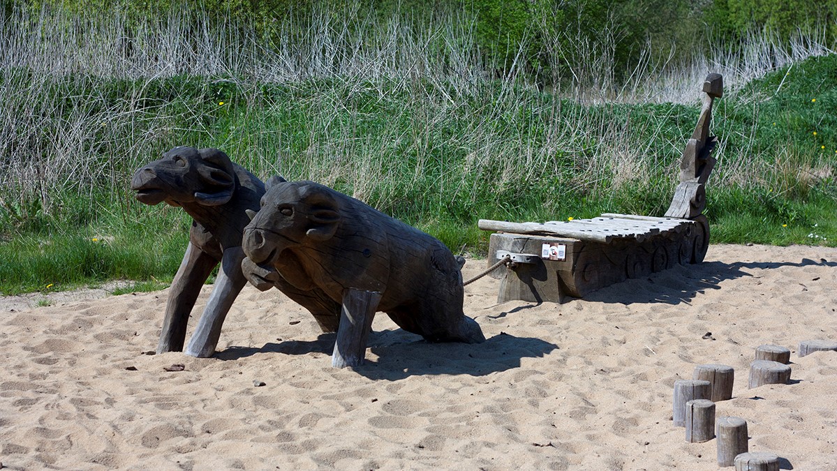 Du står nu foran Thors to drabelige gedebukke. De hedder Tandgnjost og Tandgrisner – det betyder “dem, der skærer tænder,” og hvis du rigtig ser på deres hoveder, så ser de også ret glubske ud.